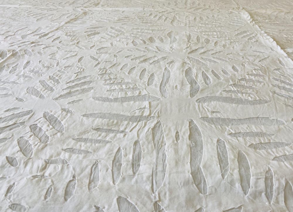 This white coloured double bed sheet has applique and cut work.